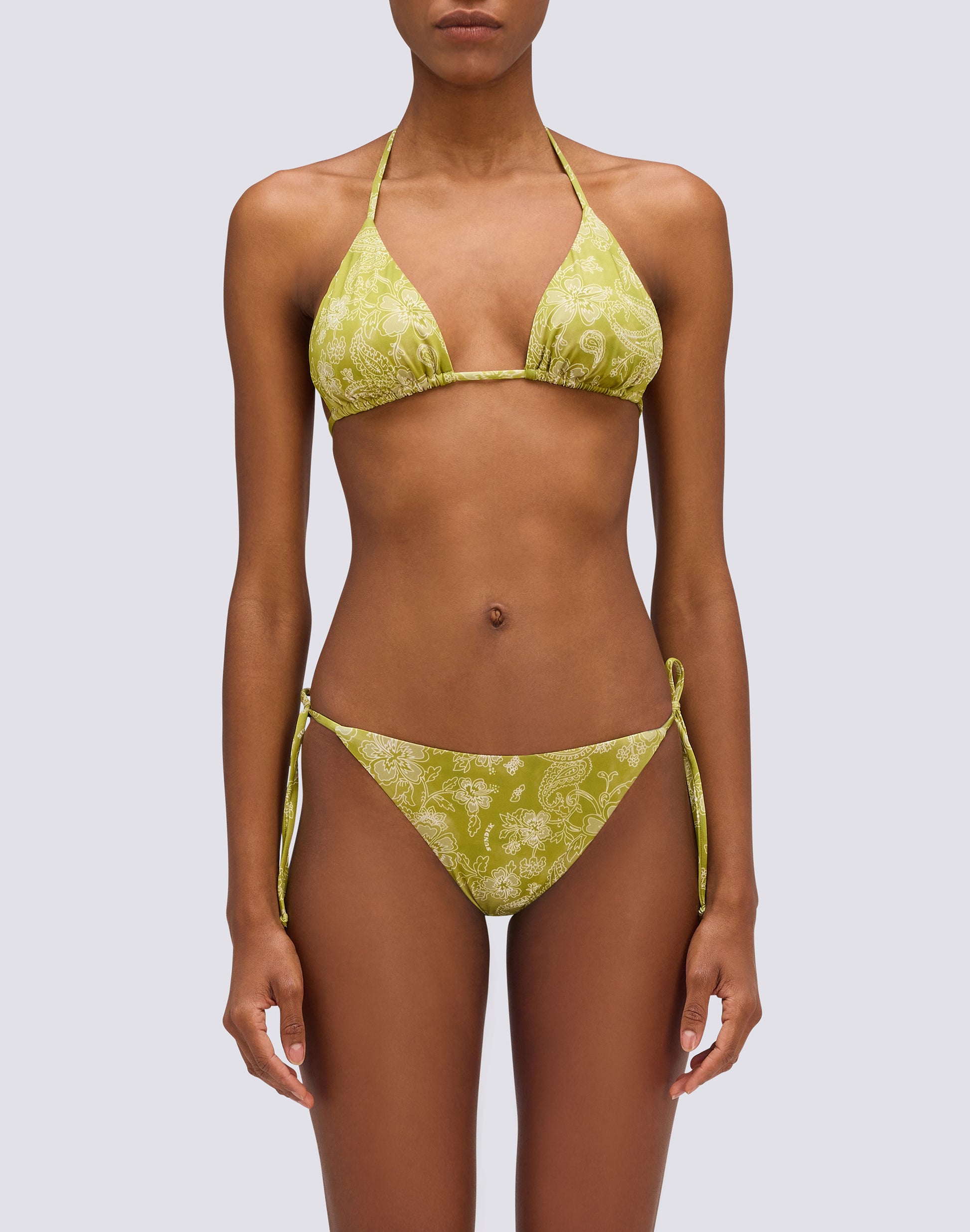 Anita bandeau bikini bottoms with paisley bandana pattern: bohemian bandana pattern, adjustable side ties, customisable fit. Perfect when paired with the Jennifer top or mixed with other tops for unique and distinctive looks. The bandana-style paisley pattern recalls the classic aesthetic of the scarf. This iconic design adds a bohemian touch, perfect for those who love bold style. The adjustable side ties are the functional detail that makes the difference. This feature allows you to customise the fit to your preferences: tighten for a more snug and high-cut fit, loosen for more coverage. Adapt the briefs to your body shape and desired level of coverage. The briefs are designed to match the Jennifer triangle top with the same paisley bandana pattern, creating a coordinated bikini. But the pattern also pairs easily with solid-colour tops for a mix-and-match look. This versatility allows you to create different combinations according to your mood and style.