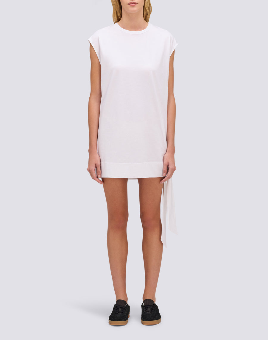 Women's cotton jersey mini dress with side knot combining comfort and distinctive details: soft stretch fabric, versatile mini length, side knot at the bottom. For those looking for casual style from the beach to the city with feminine practicality.