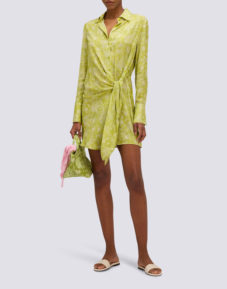 This short viscose shirt dress with Hibi Paisley print and front knot combines natural fluidity and bohemian style: long sleeves, bandana-style paisley pattern, decorative central knot. For those looking for casual versatility from the beach to the city. Viscose is a fluid, soft fabric with a silky texture that glides over the body. This natural fibre guarantees freshness and movement and is perfect for hot days.