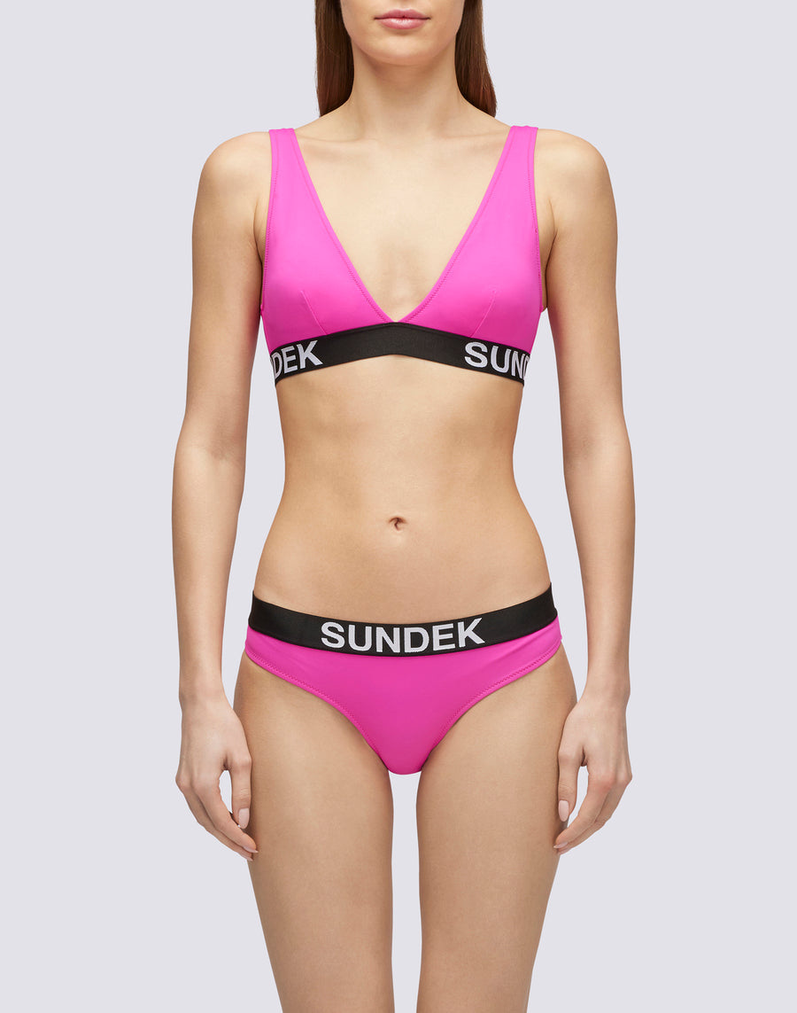 Performance fabric that supports all movements and a sporty character defined by the jacquard elastic band with contrasting logo: combine this American beach top with the coordinated briefs to create a strong look that will not go unnoticed.