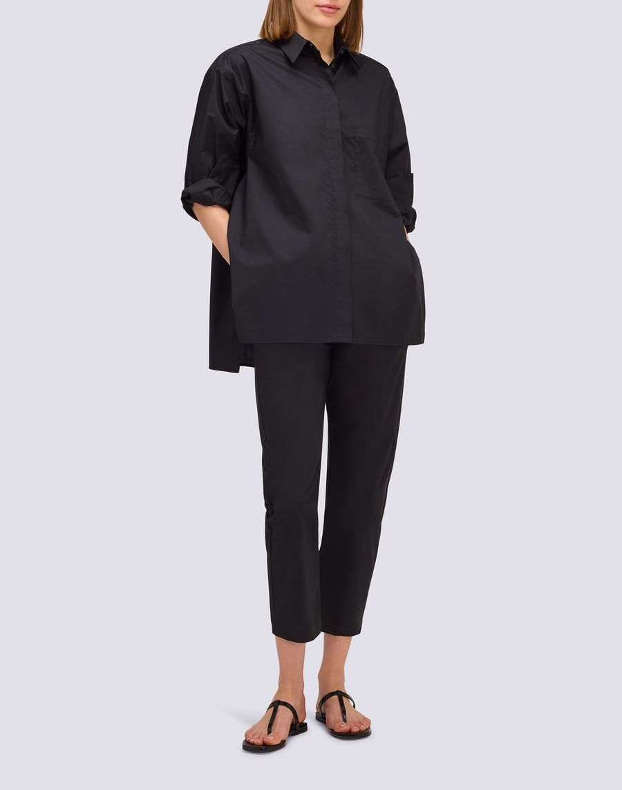 Women's long trousers in regular fit poplin and cigarette cut. Equipped with an adjustable waist and side pockets. Perfect for spring or summer evening looks. Can be worn with t-shirts, tops or blouses.
