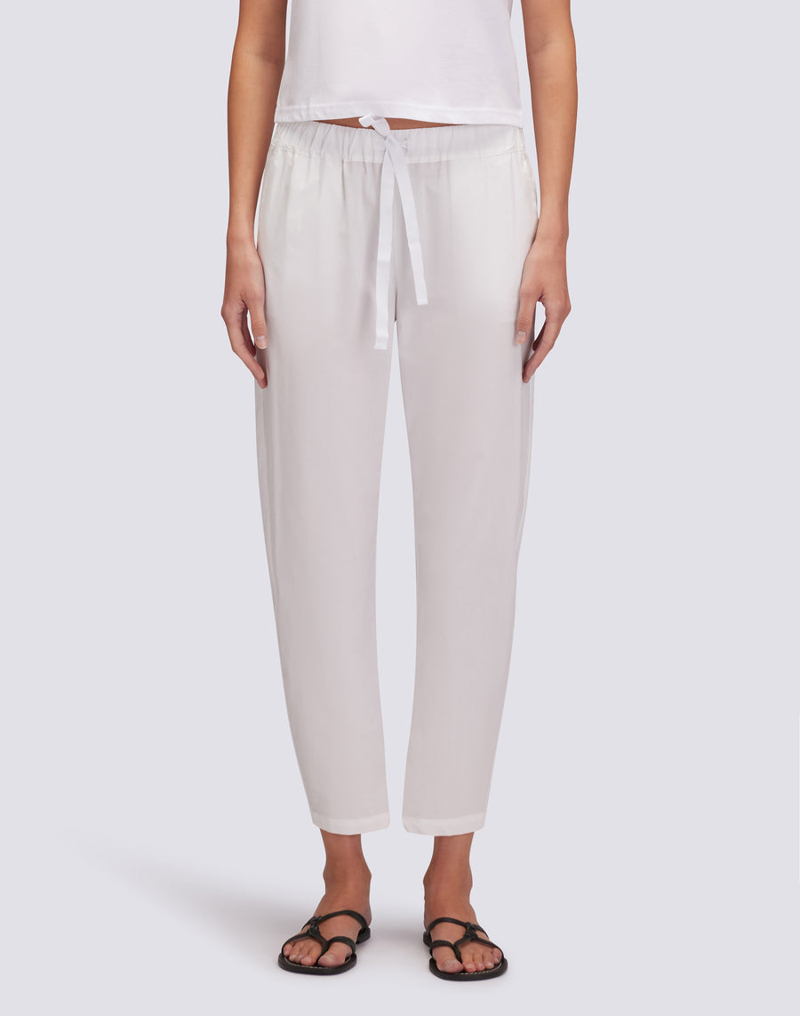 Women's long trousers in regular fit poplin and cigarette cut. Equipped with an adjustable waist and side pockets. Perfect for spring or summer evening looks. Can be worn with t-shirts, tops or blouses.