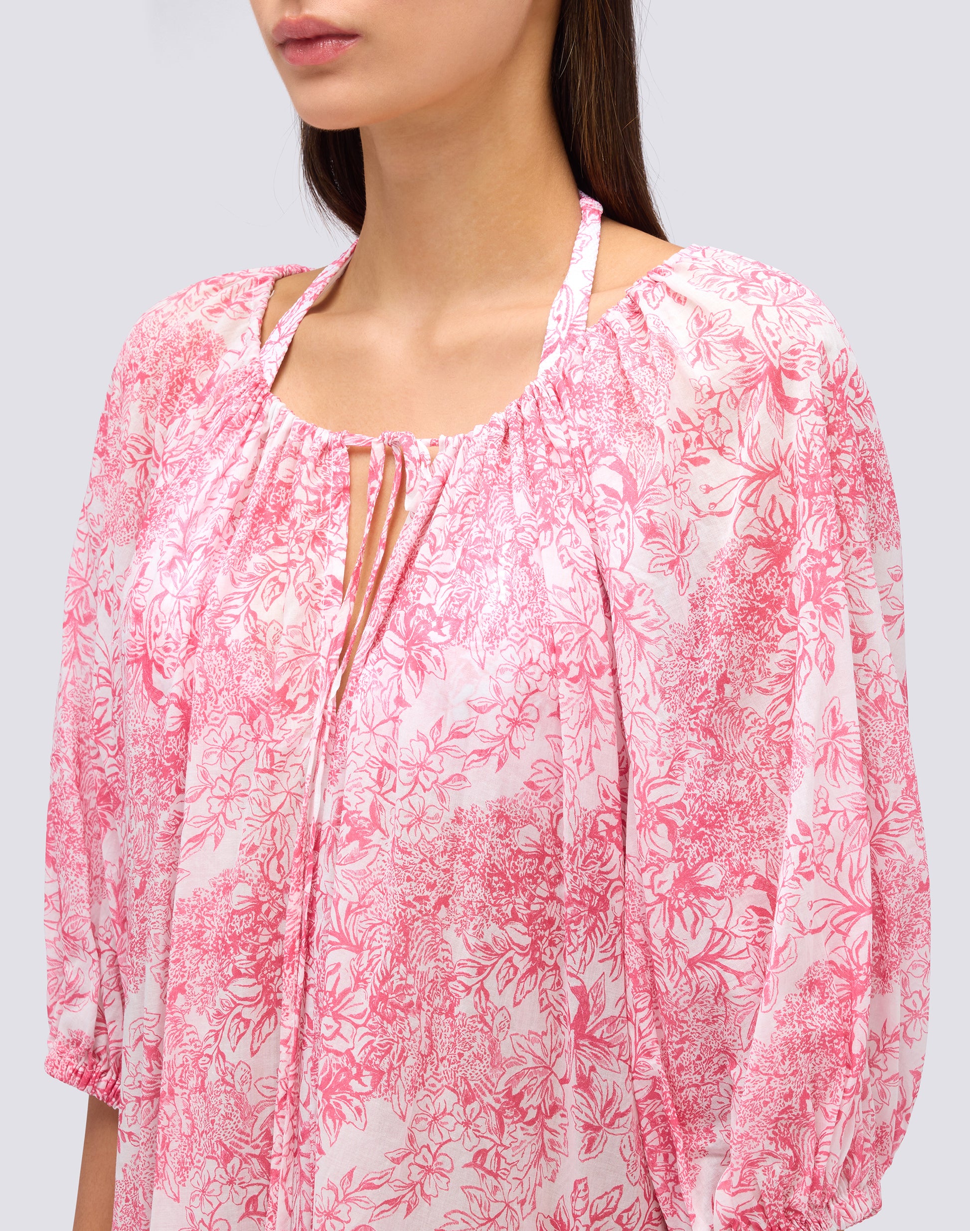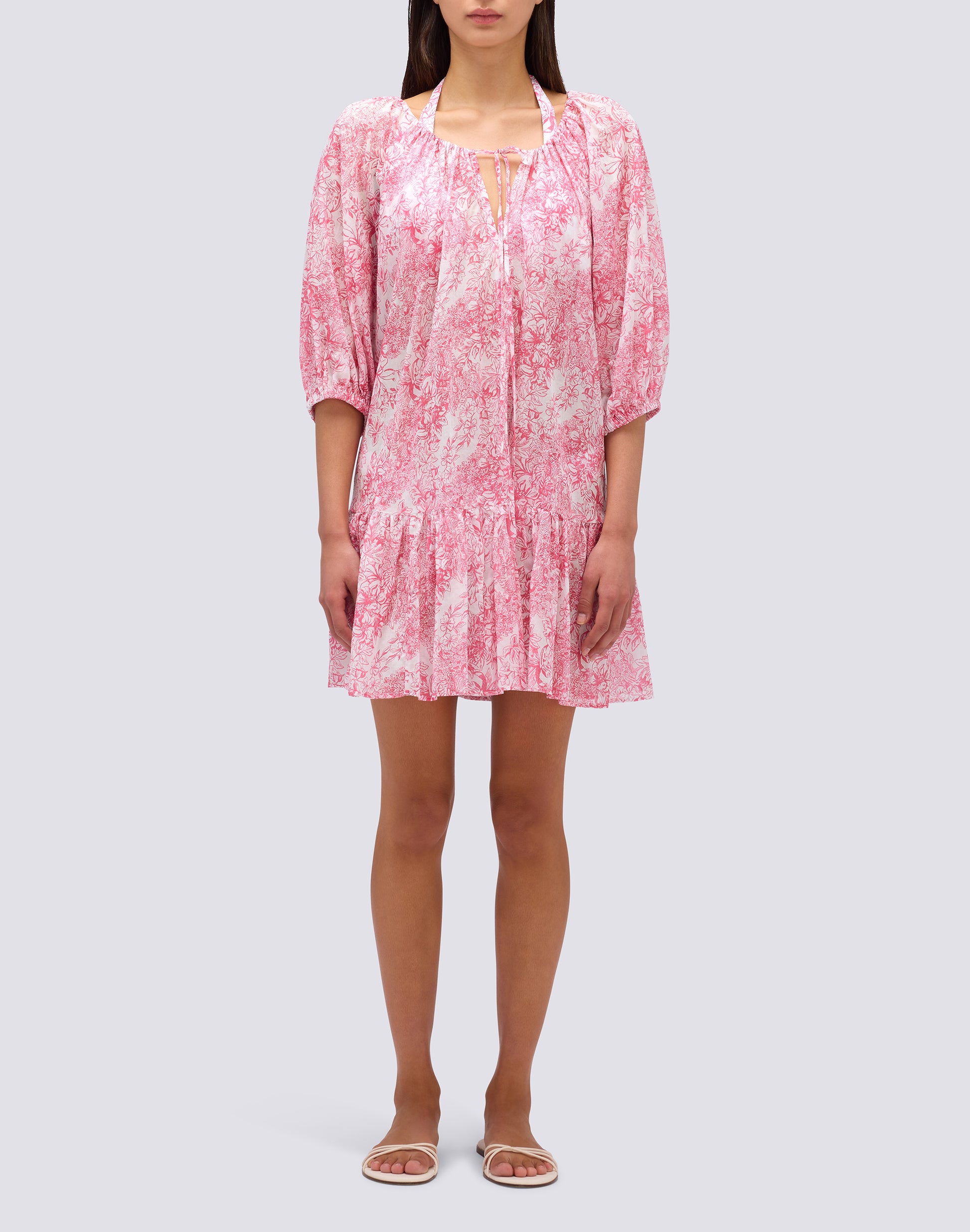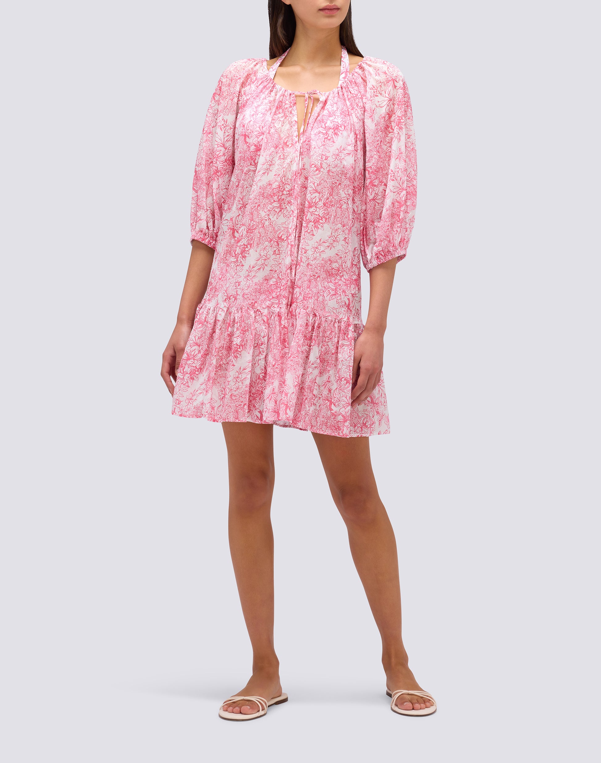 Short dress in Fleur de Joie print with gathered shoulder straps and adjustable drawstring at the front. Fresh, refined, super chic.