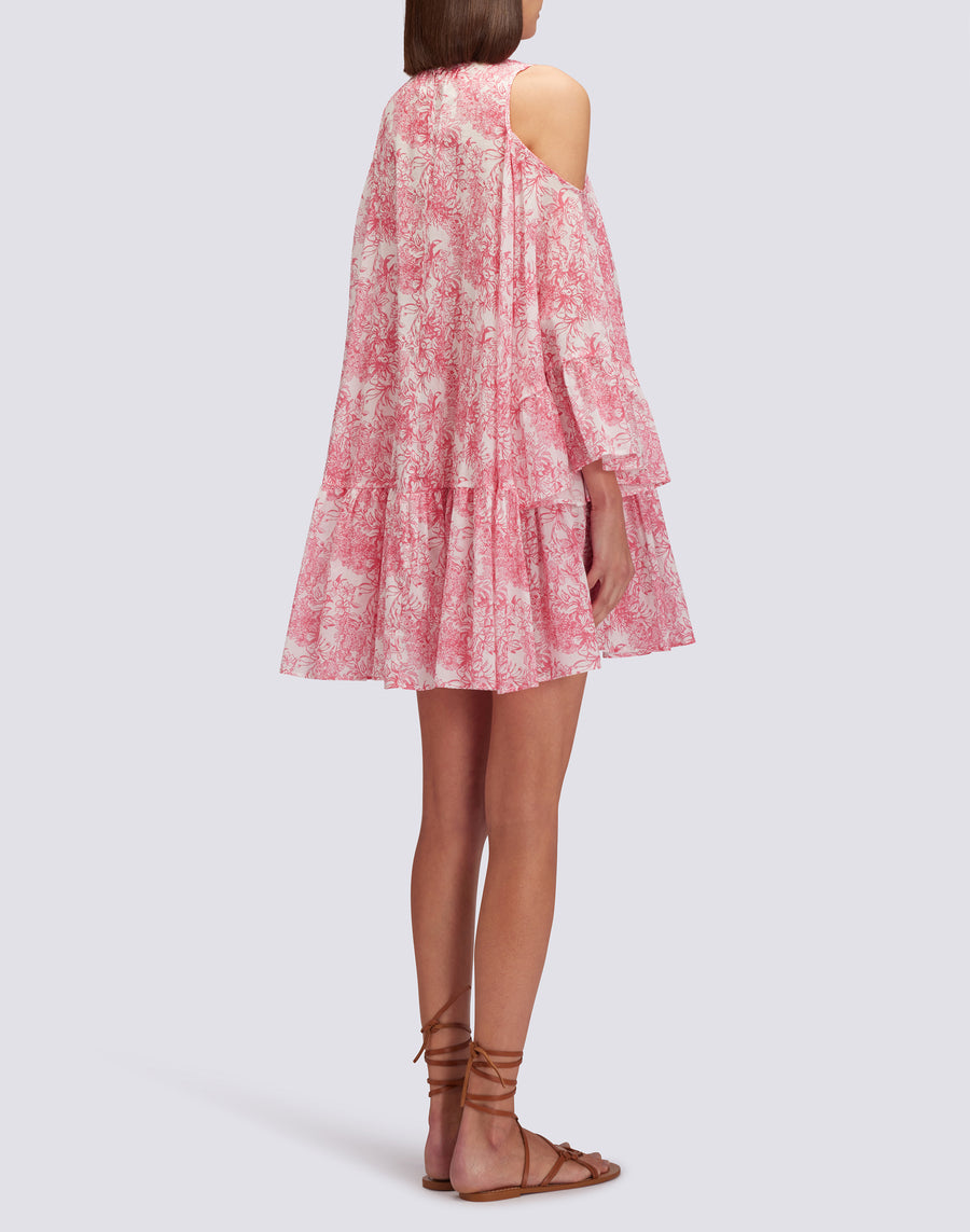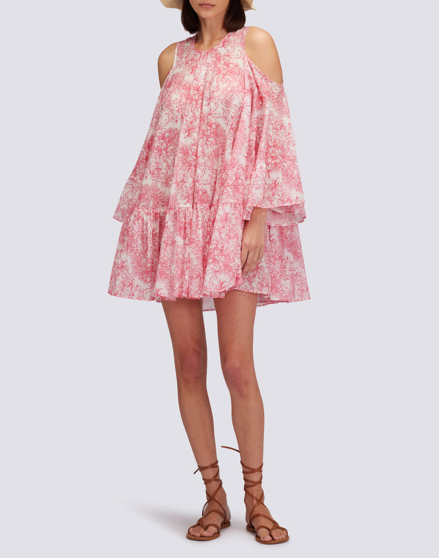 Elegant short dress in Fleur de Joie print with long sleeves and bare shoulders. Ideal for your summer evenings or for an aperitif on the beach at sunset.