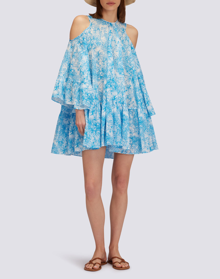 Elegant short dress in Fleur de Joie print with long sleeves and bare shoulders. Ideal for your summer evenings or for an aperitif on the beach at sunset.