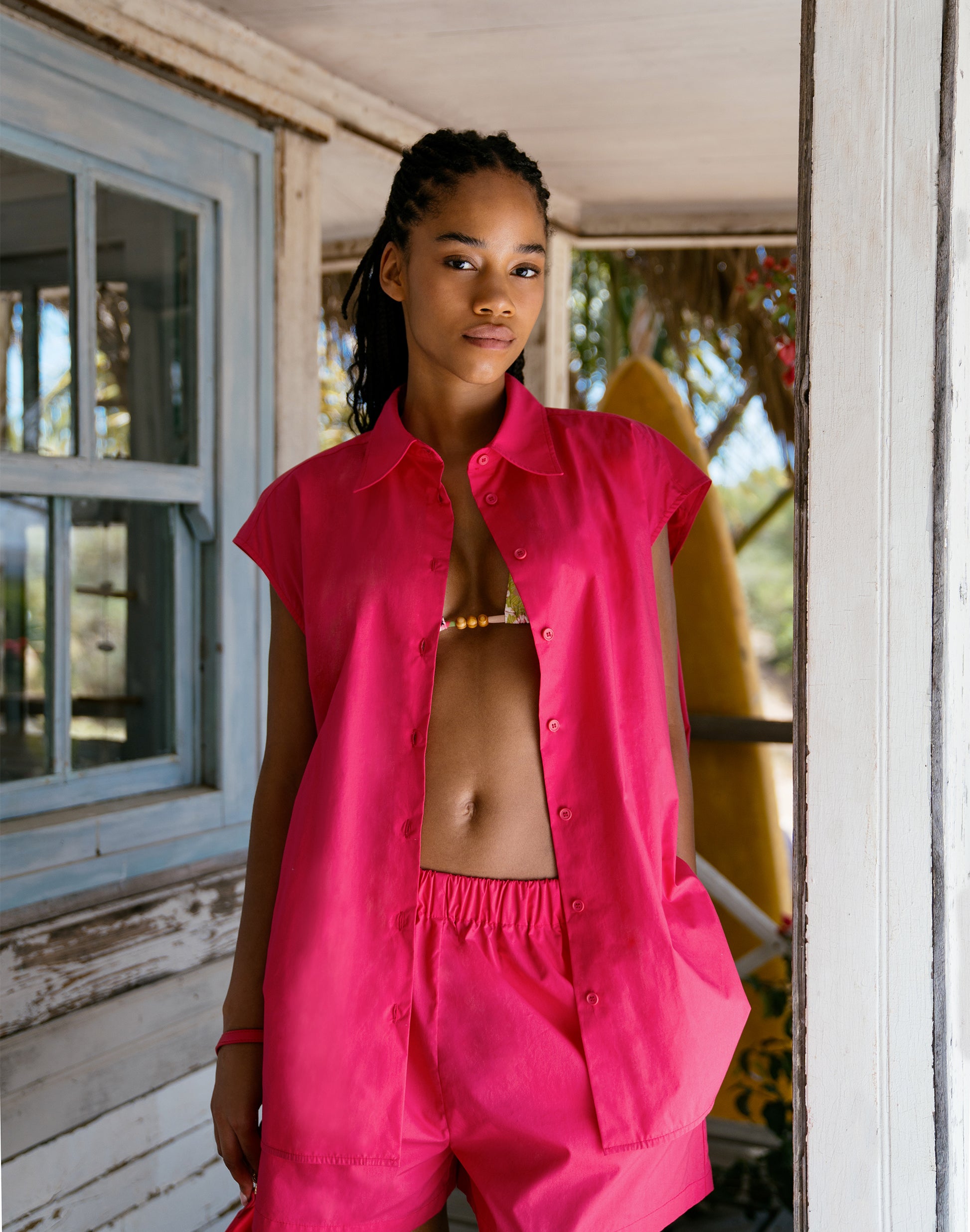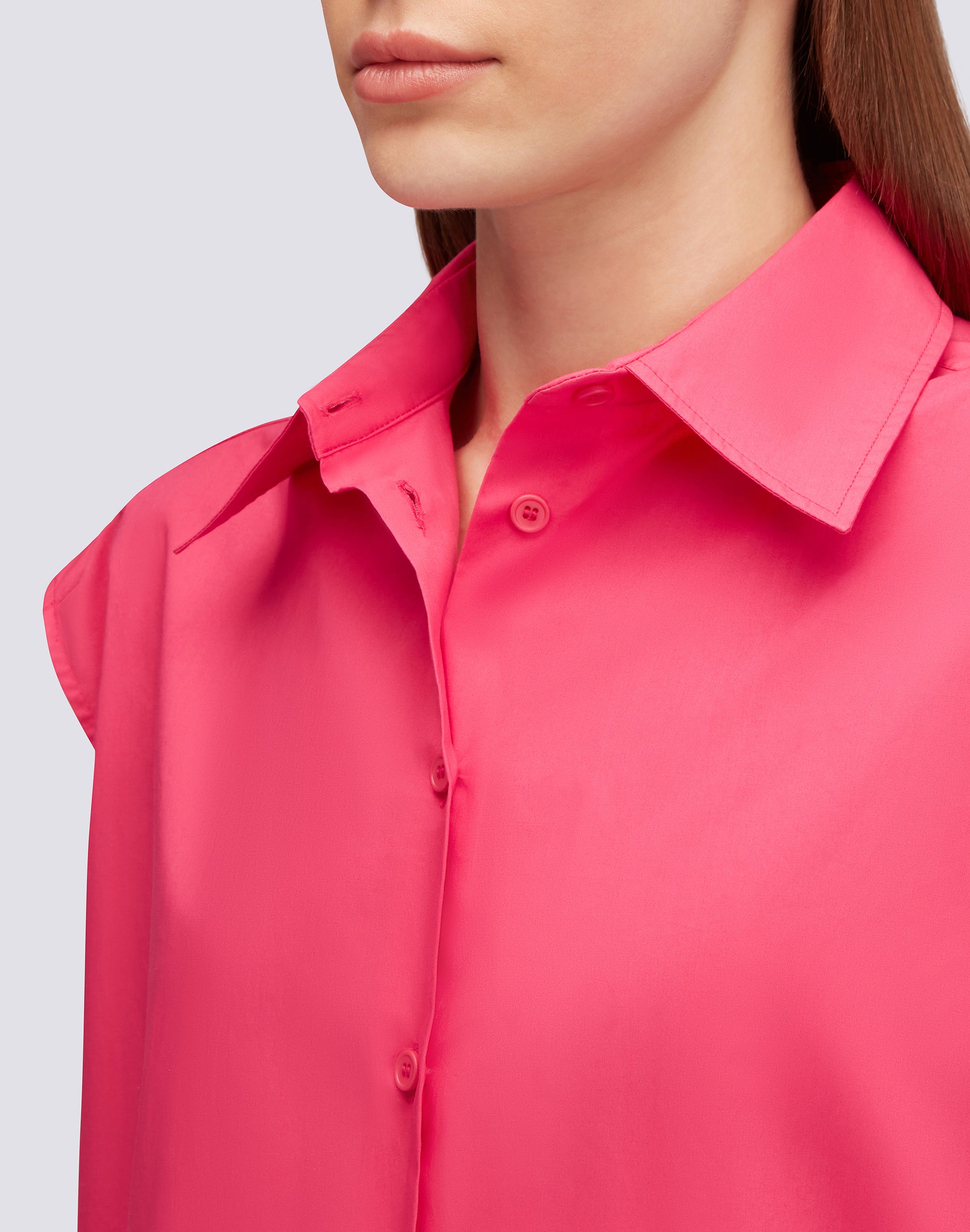Women's sleeveless poplin shirt with buttons and round side slits. Fit over.