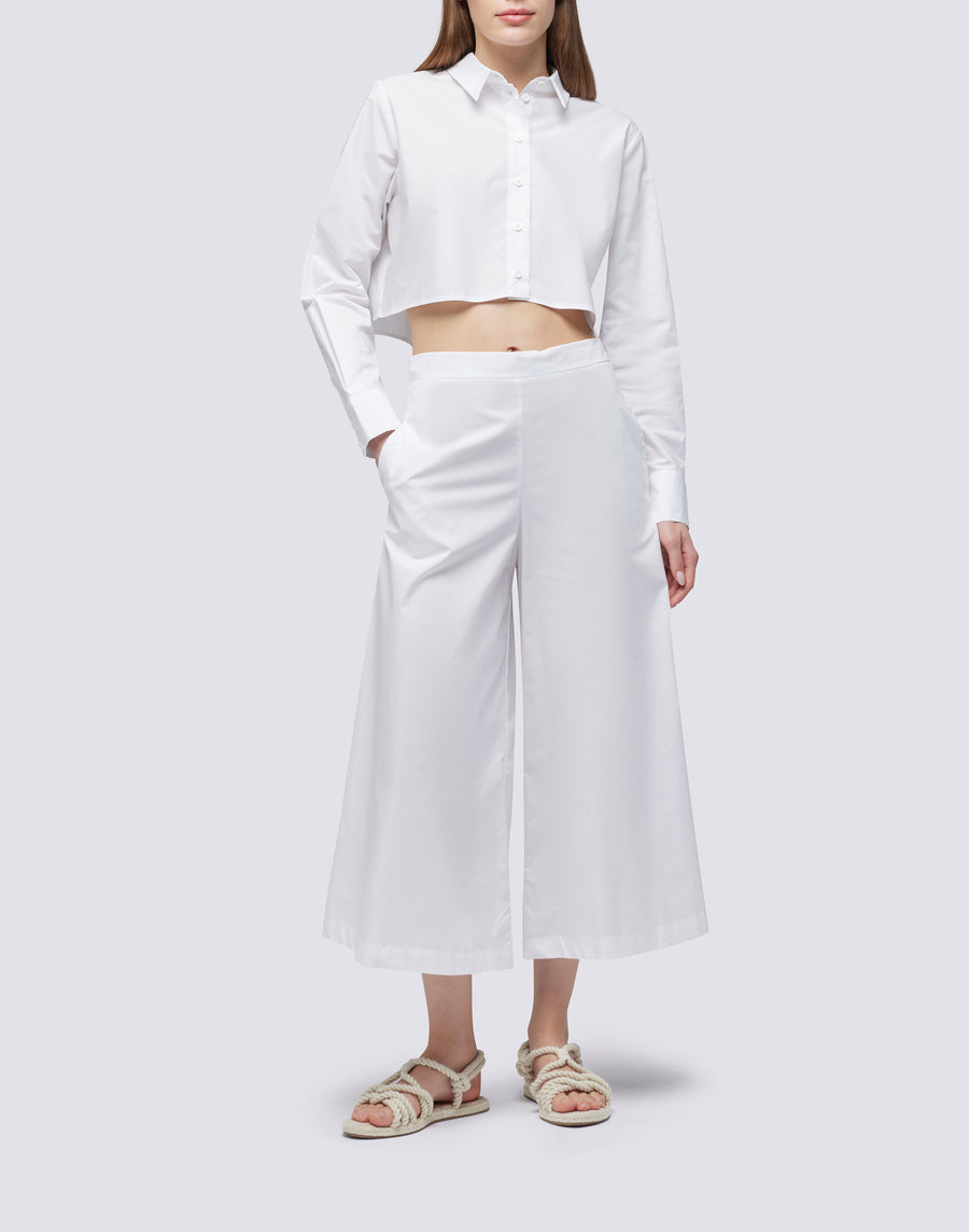 Wear the high-waisted poplin palazzo trousers for an elegant and comfortable look. The poplin cotton makes them light and fresh, perfect for summer days. Ideal for any occasion, they will give your outfit a touch of class and comfort.