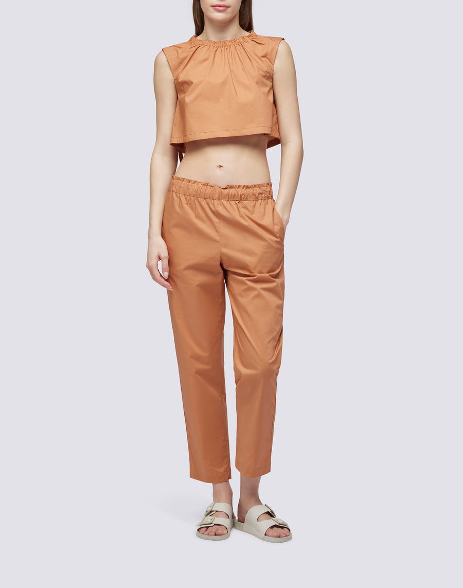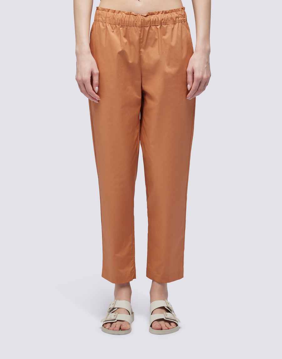 Multitasking trousers in cotton poplin with a slightly carrot cut, straight and narrower at the bottom. High elastic waistband and internal adjustable drawstring for maximum comfort.