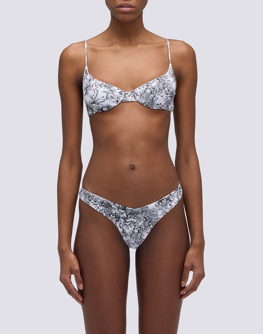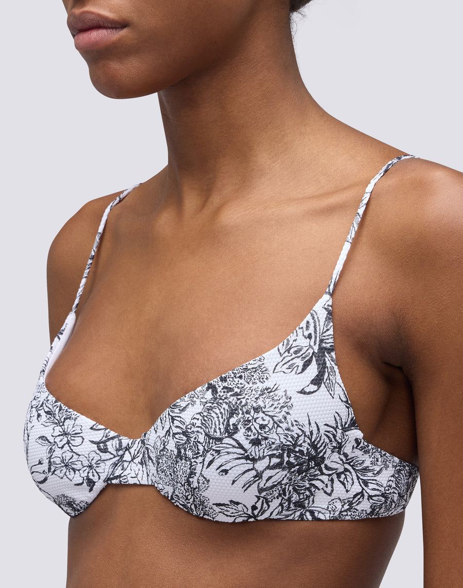 Romantic bralette in Fleur de Joie pattern with underwire and adjustable ties. To be matched with the matching briefs to create a bikini with a refined style.