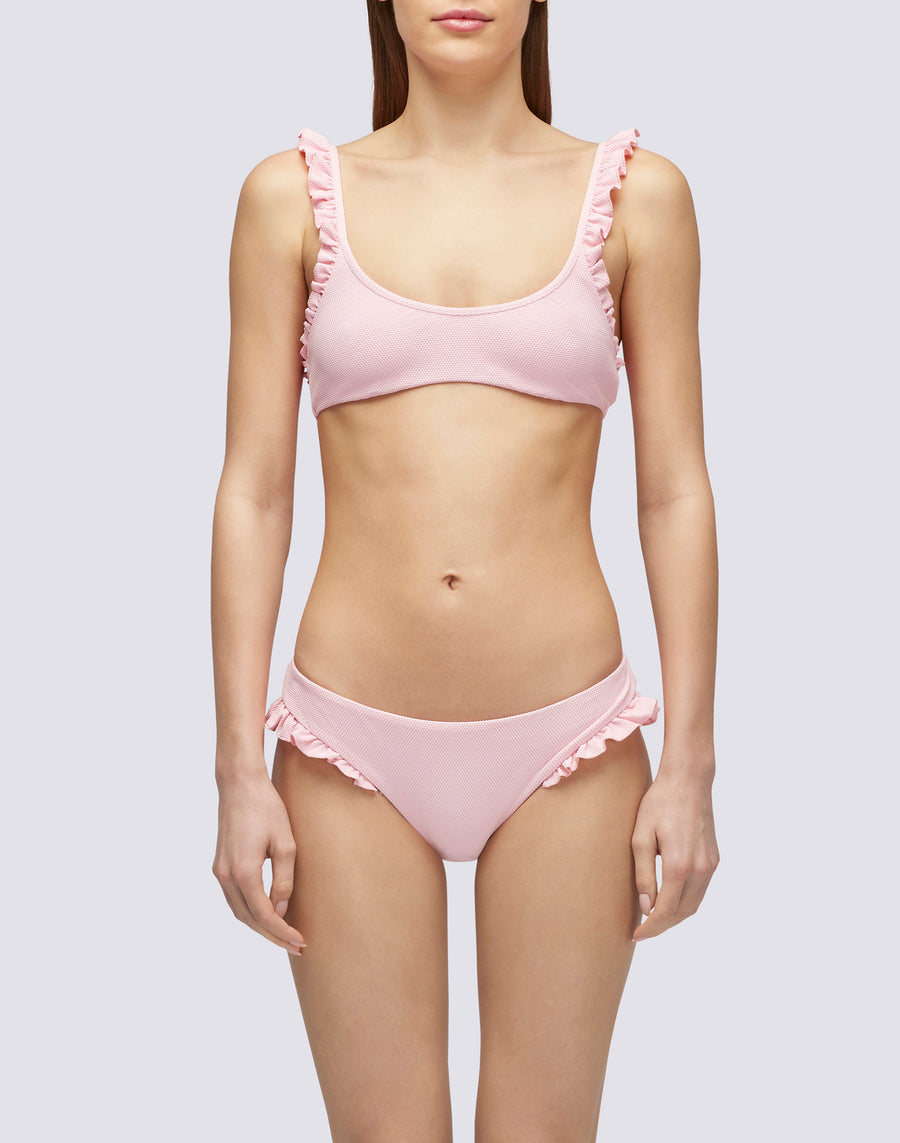 The bralette top with ruffles is a must-have for your summer wardrobe. Made of soft pique fabric, comfortable and fashionable, this bikini top will add a touch of elegance to your beach looks. To be combined with the coordinated briefs.