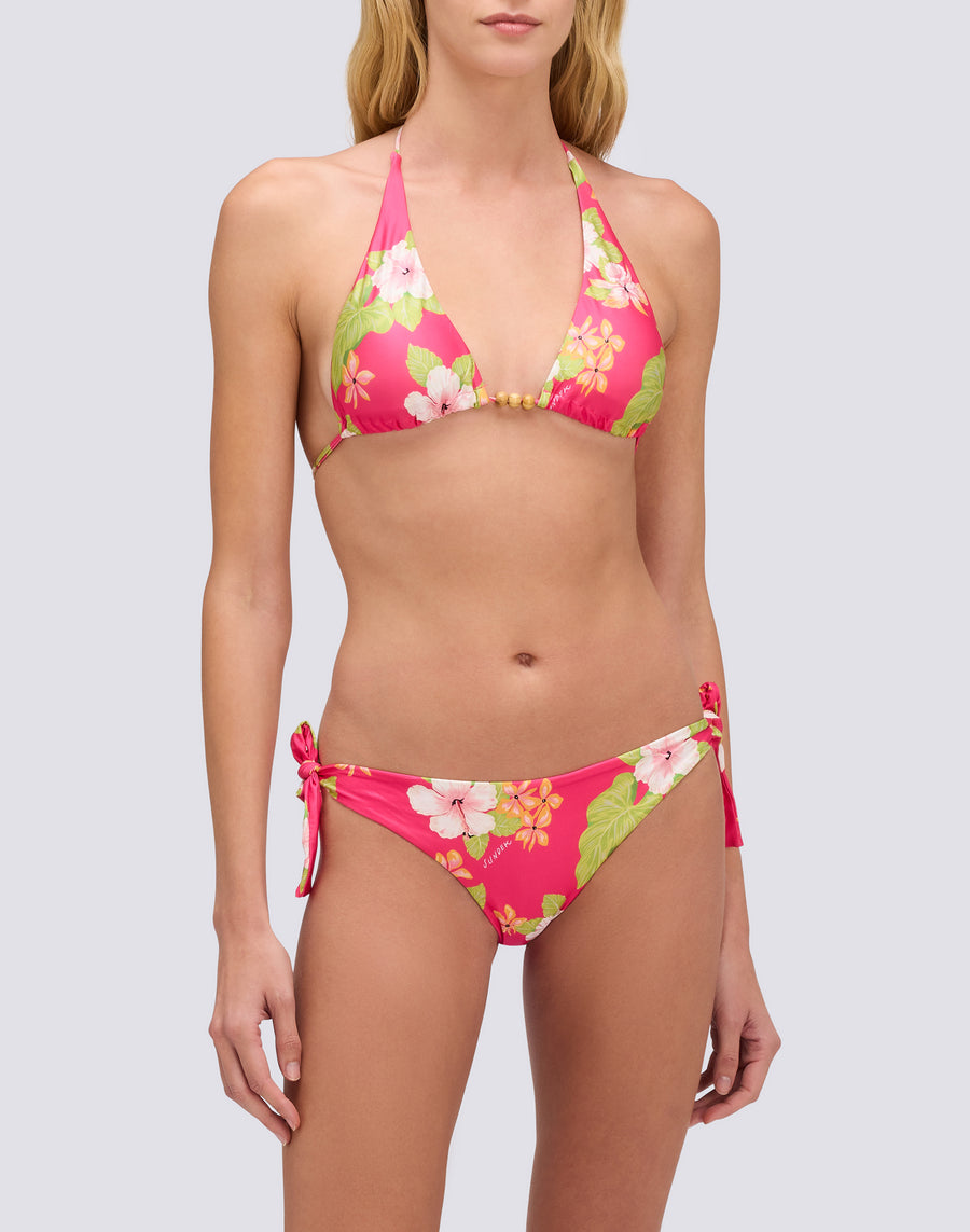 Garbo American triangle top in Dreamy Hawaii print, with wooden beads decorating the ties. Removable padding and regular fit. Matching briefs sold separately.
