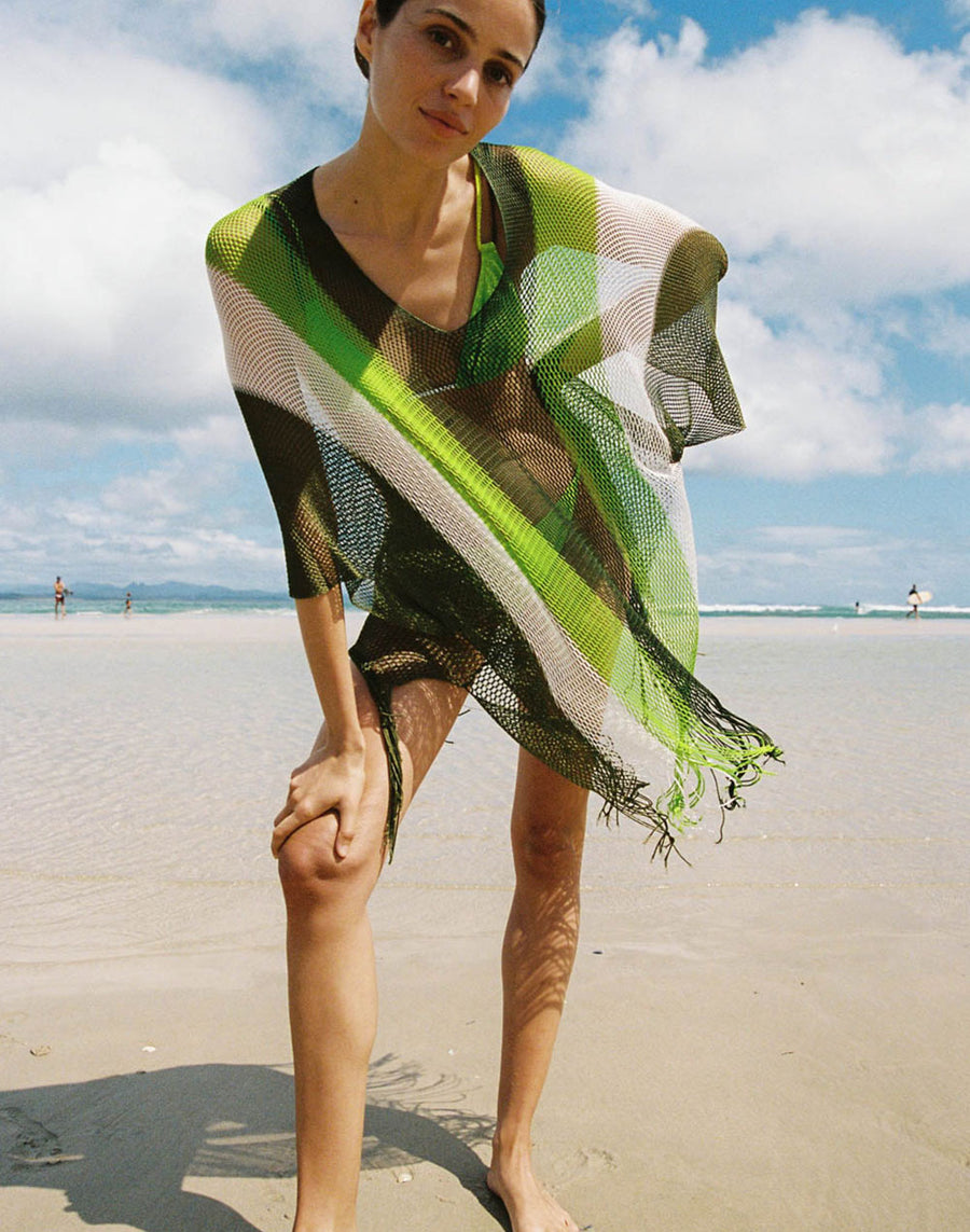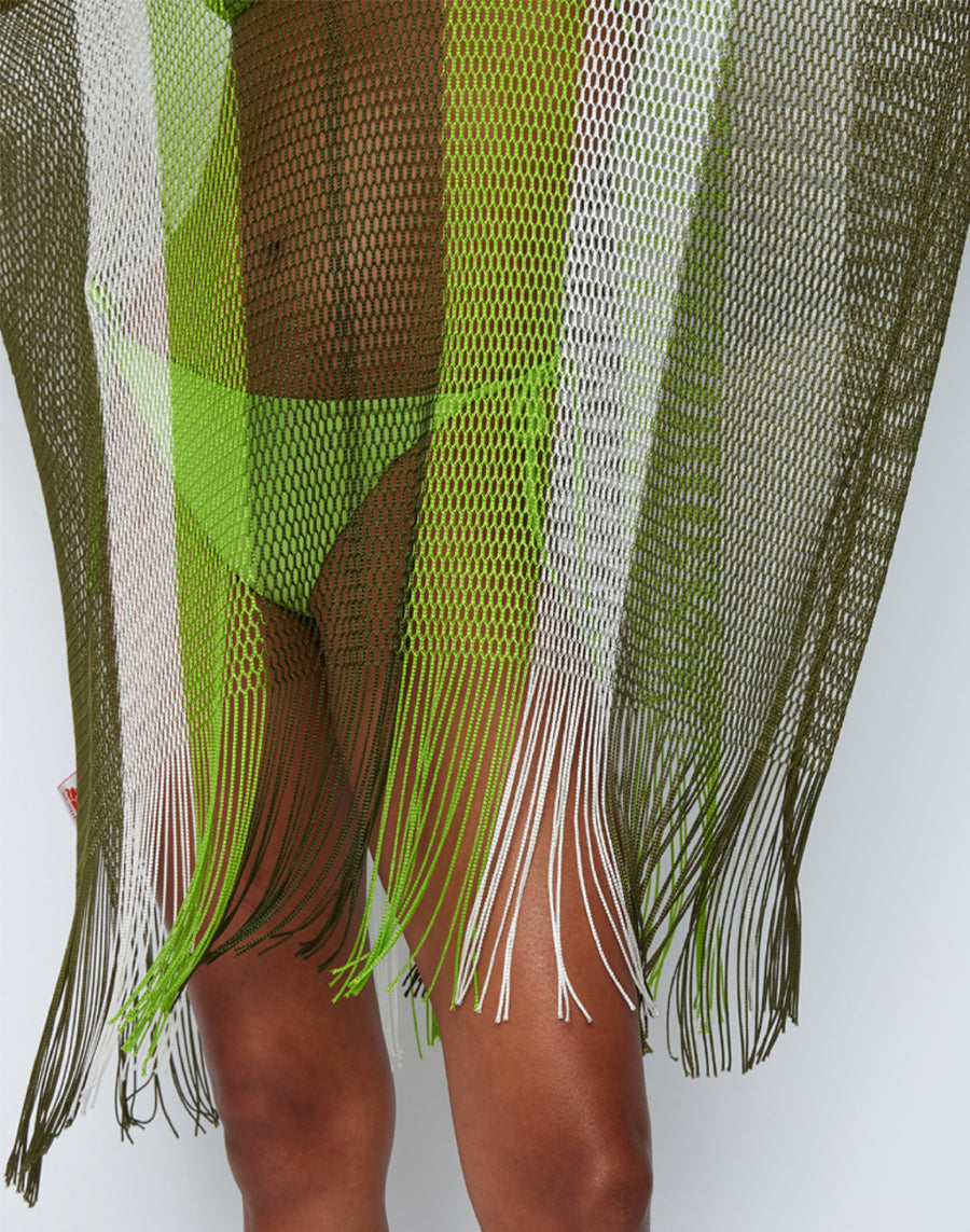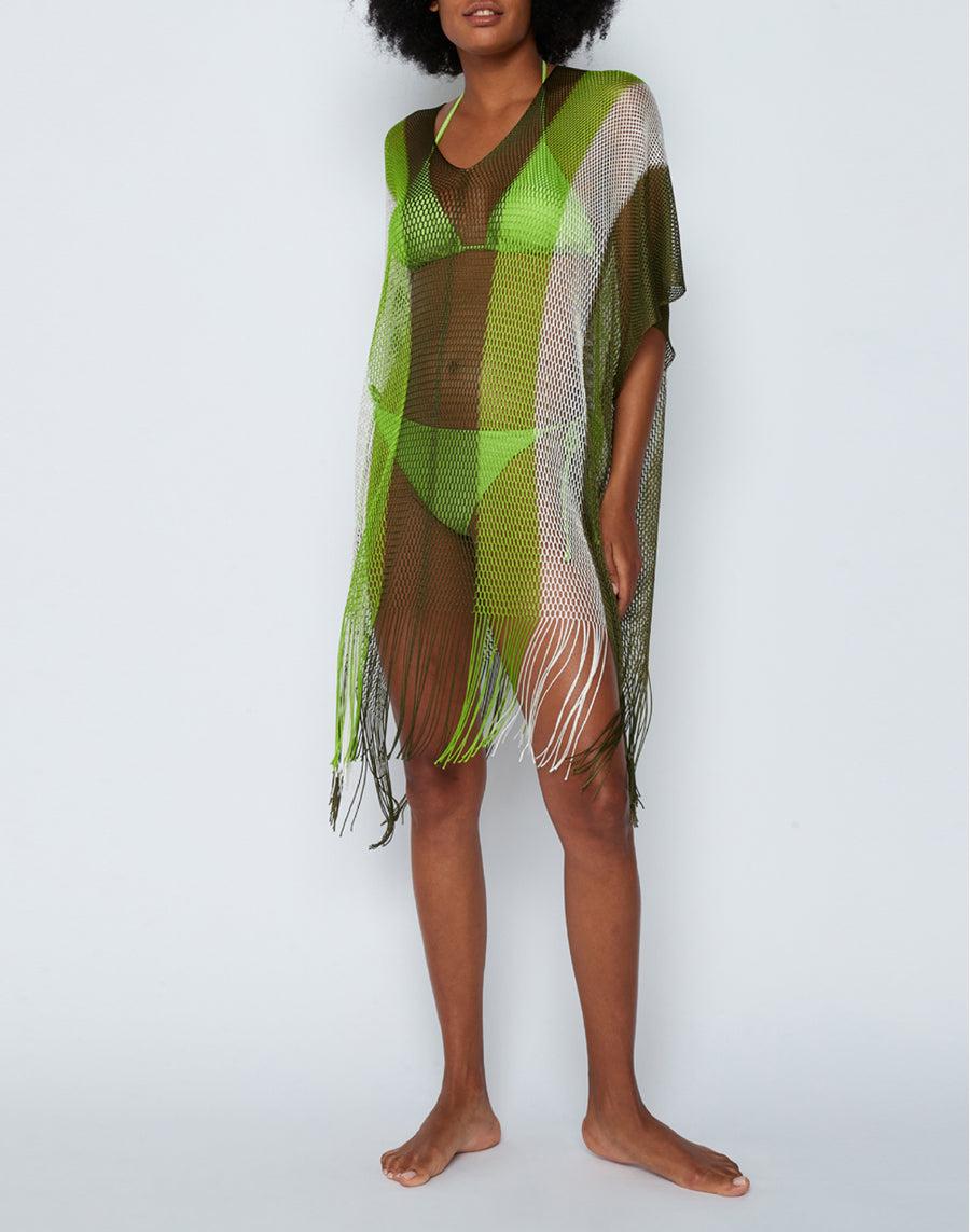 Colorful kaftan with fringes and V-neck. It falls softly over the bikini and gives a touch of elegance to the beach look.