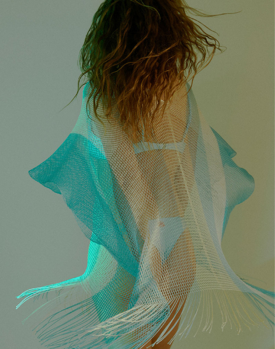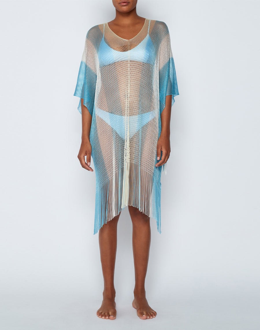 Colorful kaftan with fringes and V-neck. It falls softly over the bikini and gives a touch of elegance to the beach look.