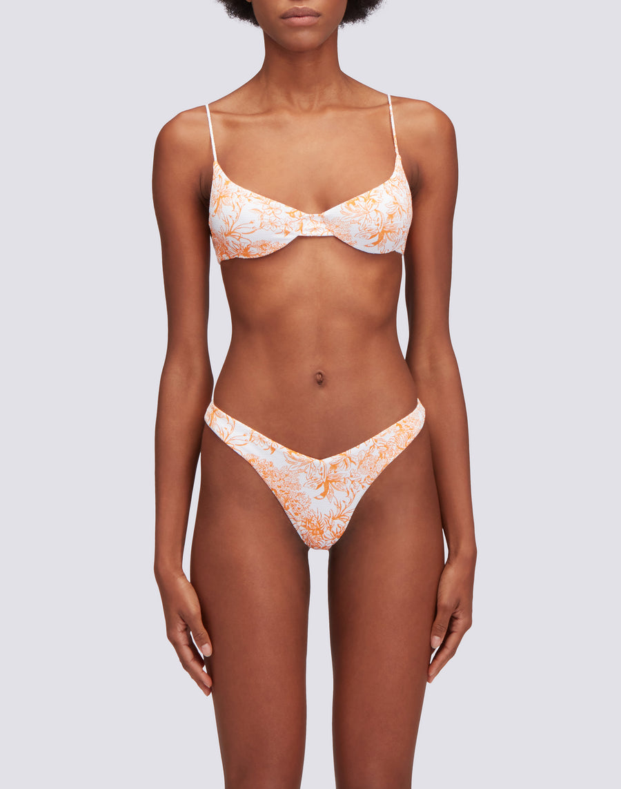 Romantic briefs in Fleur de Joie print, low cut and high-waisted, are suitable for those looking for a slim-fitting bikini. The piqué fabric offers softness and comfort. Match it with the matching top, sold separately.