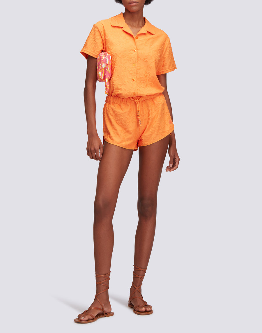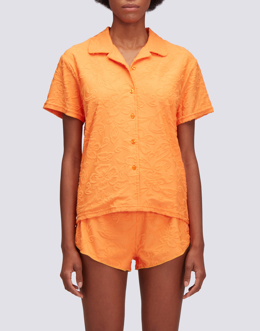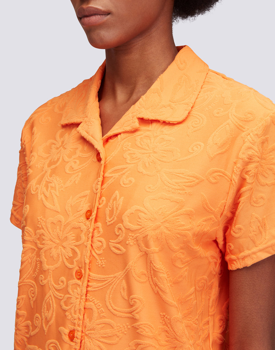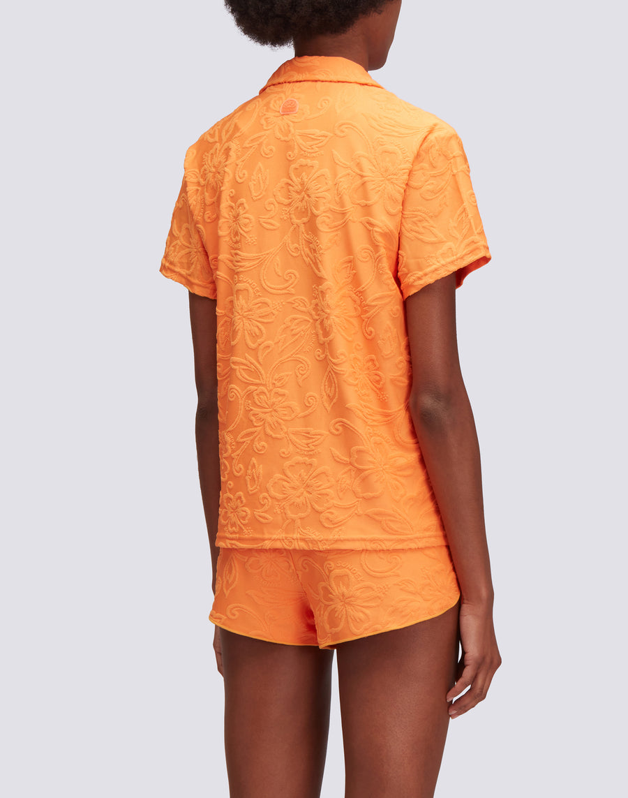 Women's bowling shirt in jacquard terry with SK23 pattern, ideal to combine with bikini sets and shorts from the same programme to create colourful and unique looks.