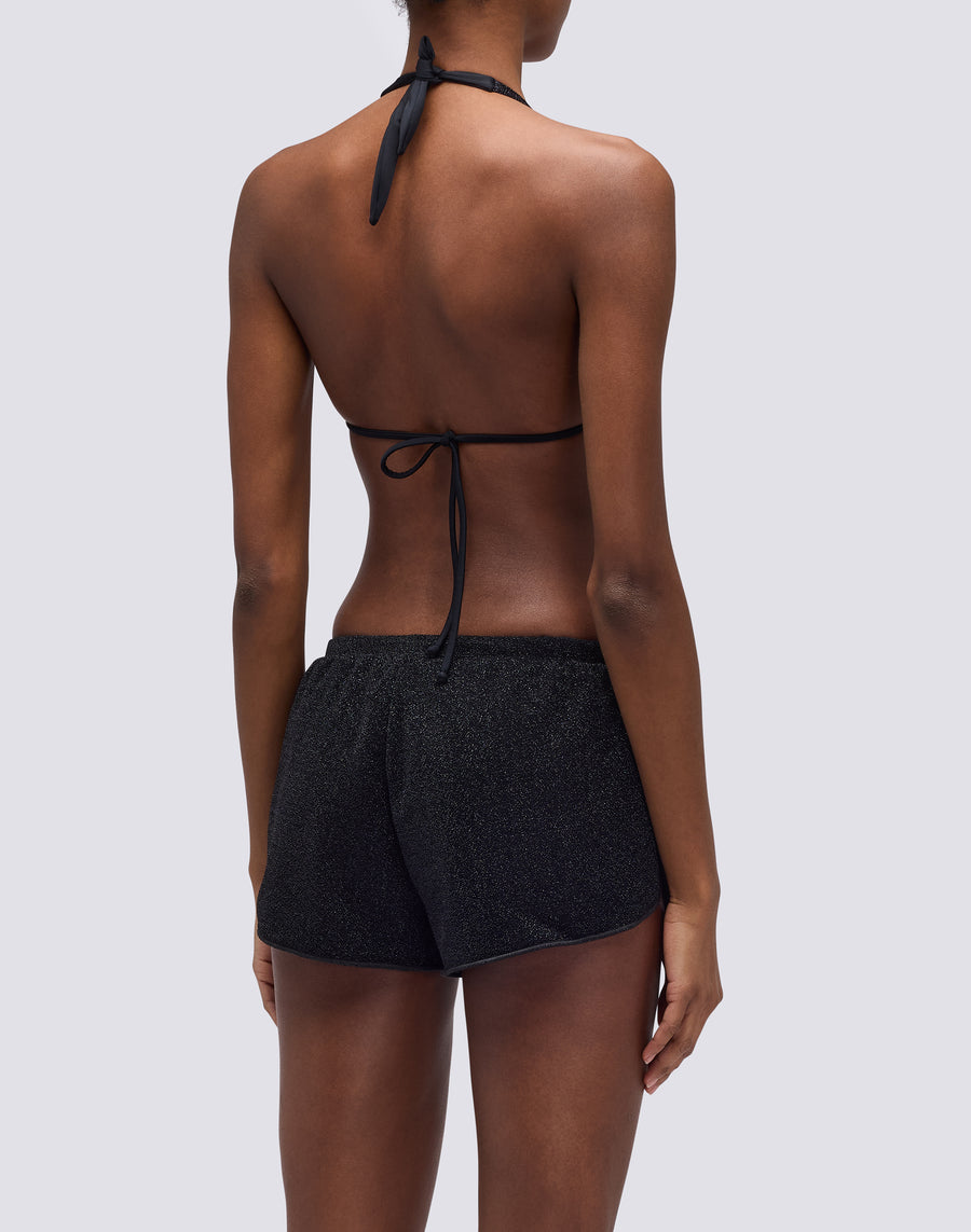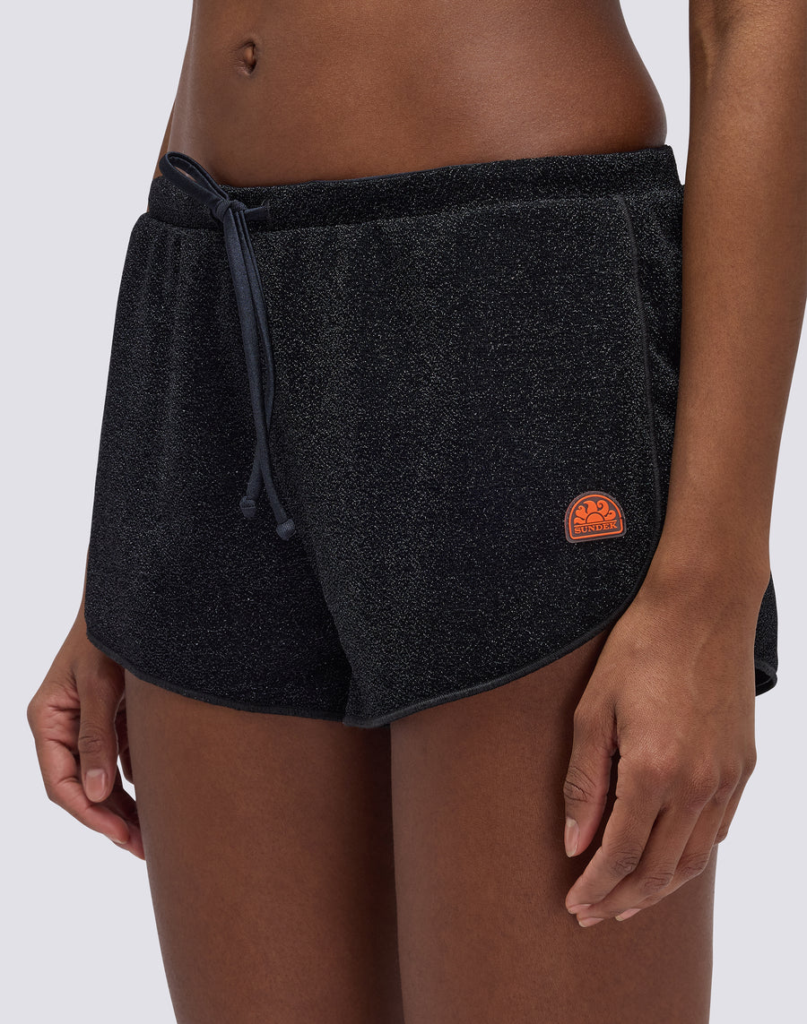 Short and light women's beach shorts in lurex, easy to combine with your favourite swimwear to make every beach day perfect.