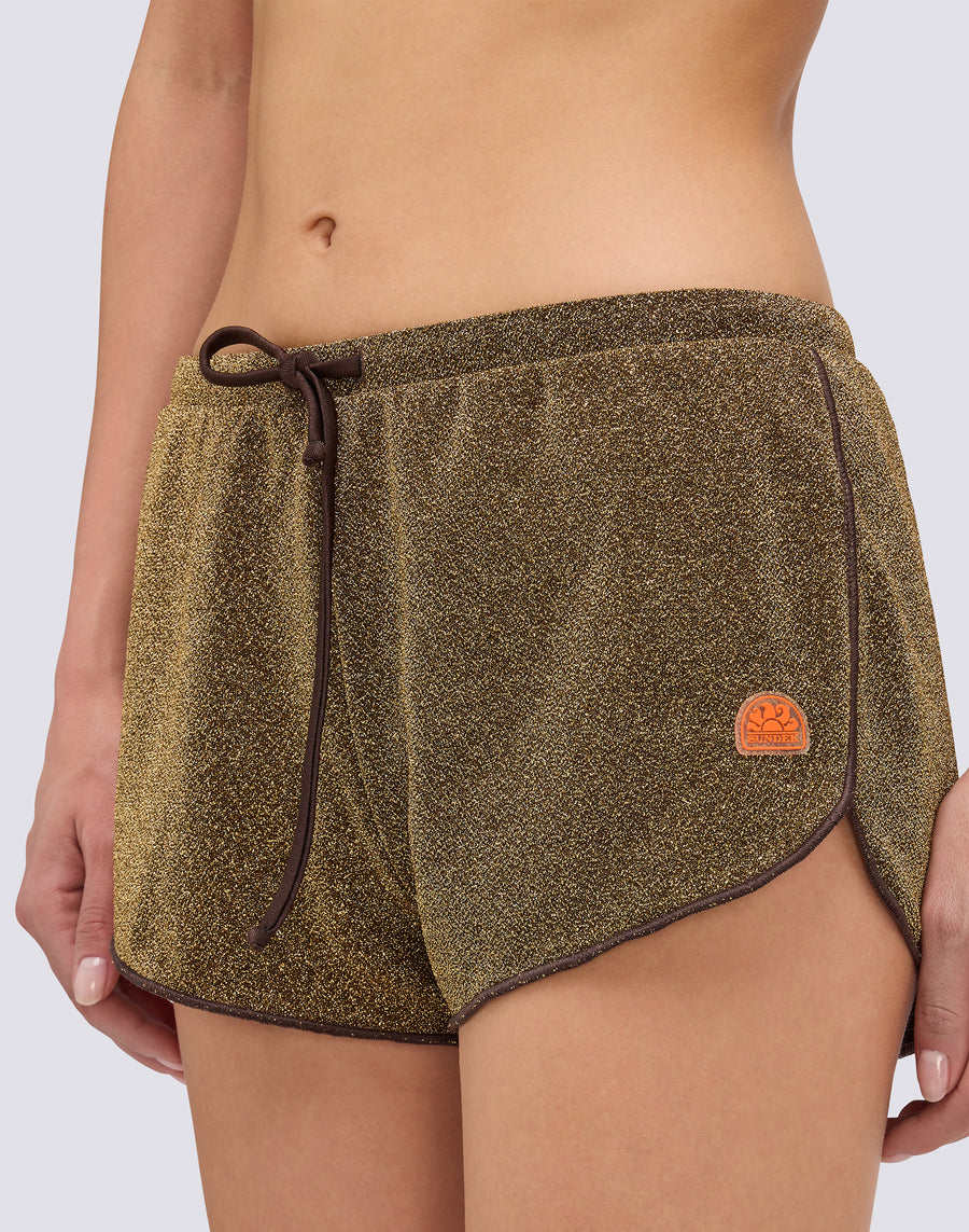 Short and light women's beach shorts in lurex, easy to combine with your favourite swimwear to make every beach day perfect.
