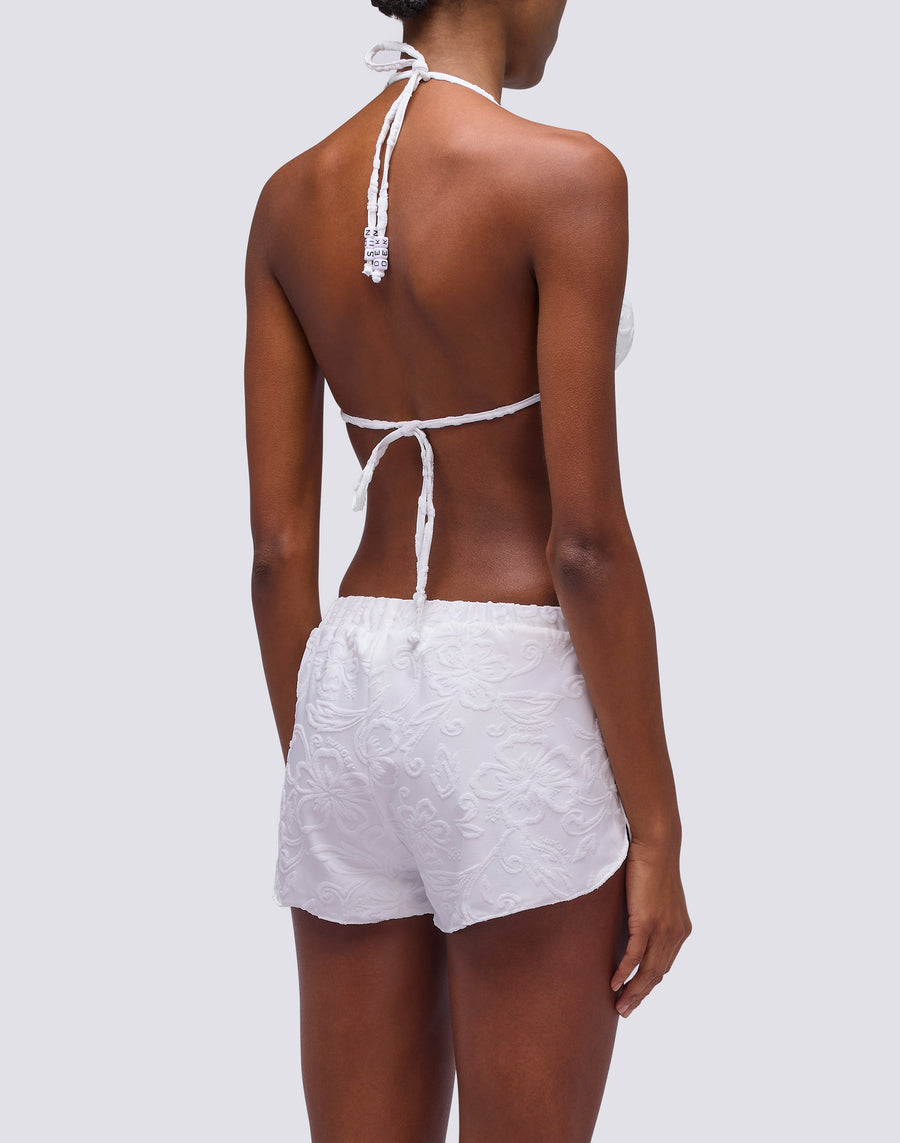 Women's jacquard terry shorts with SK23 pattern. With an elasticated waist and drawstring, they are perfect to wear over the matching patterned bikini.