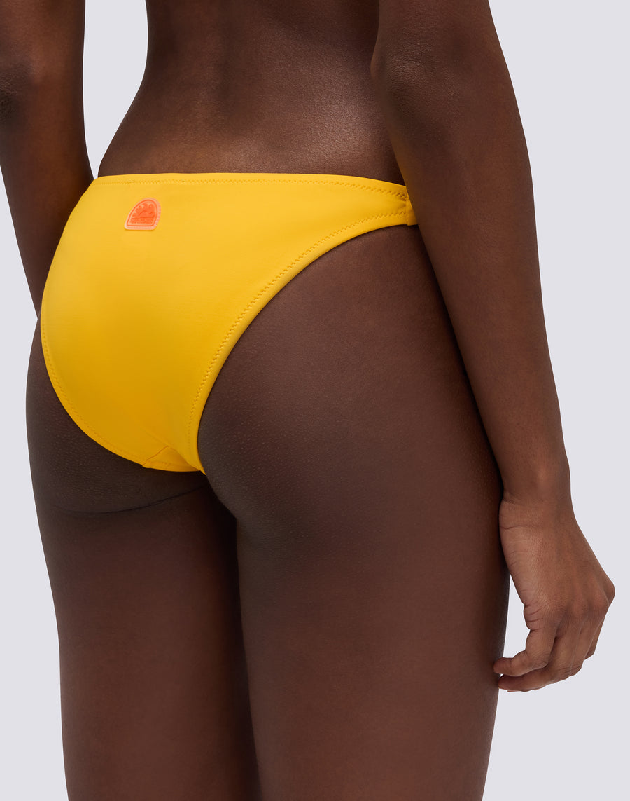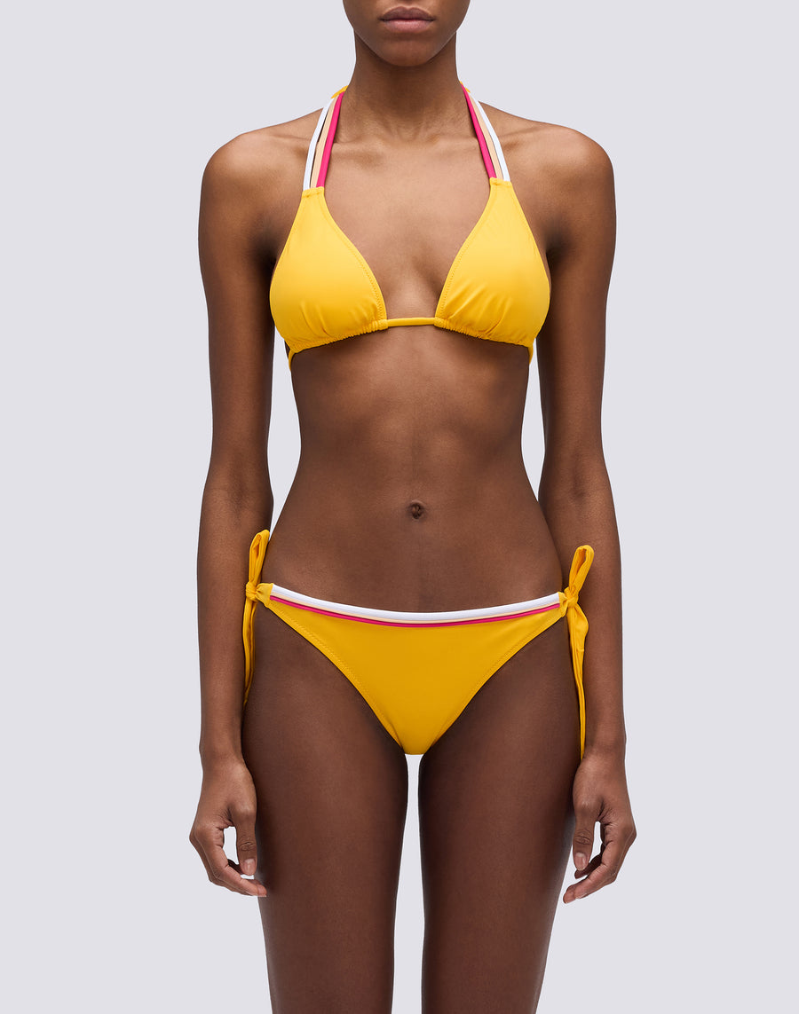 Made up of a wide triangle top and adjustable briefs, this women's bikini is finished with Sundek's iconic tricolour bands. The wide padded triangle top and regular fit adjustable tie-side briefs will make great additions to your beachwear collection. It is personalised by the tricolour bands that enrich the triangle ties and the waistband of the brief.