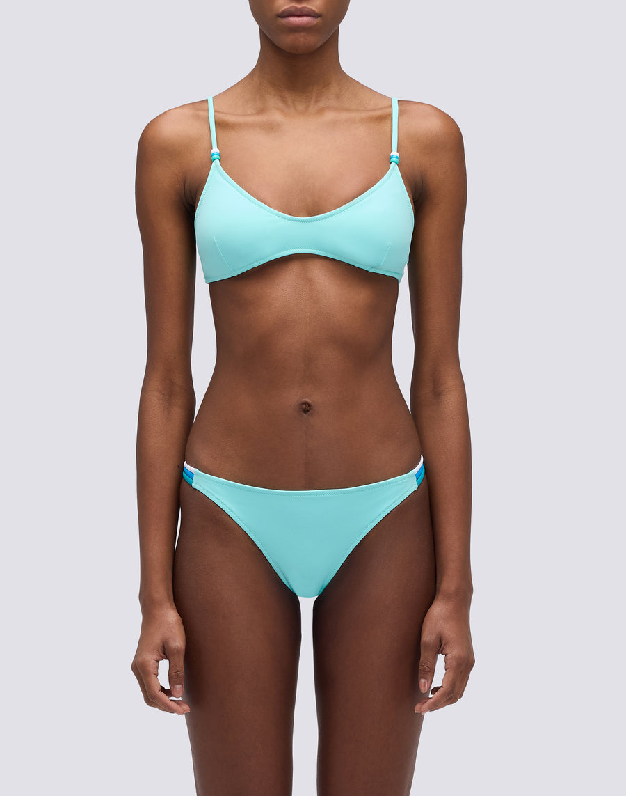 If you love trendy designs, you can count on this beach bikini consisting of a padded bralette top with multi-coloured beads and a Brazilian-style bottom with three-coloured bands at the hips.