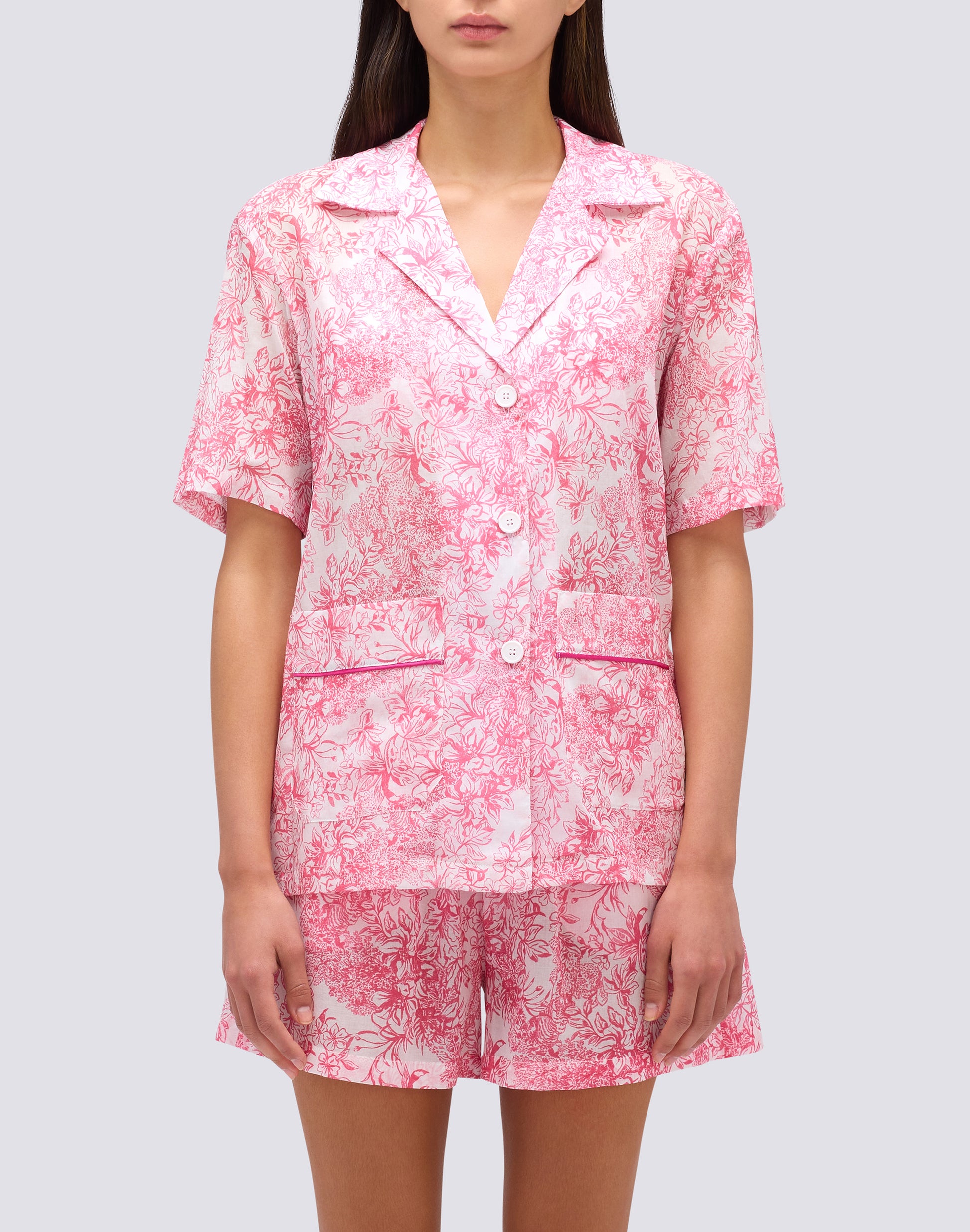Women's shirt in Fleur De Joie pattern, to be combined with the bikinis or shorts from this collection, made in the same pattern, to create coordinated looks.
